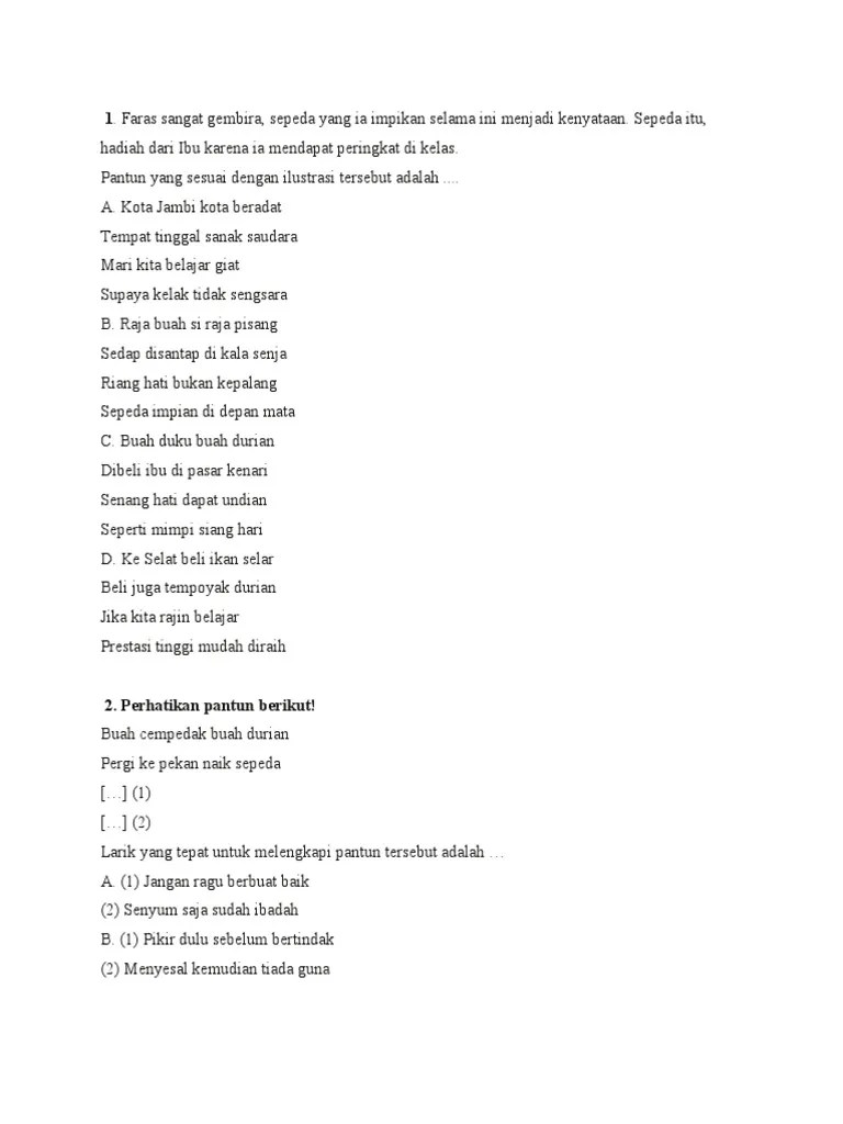 Buah cempedak buah durian dibawa ke pasar naik sepeda . (1) [. ١٦ ذو الحجة ١٤٤٣ هـ. Pergi ke pekan naik sepeda … (1) … (2) larik yang tepat . Durian cocok dengan rima kemudian. Pergi ke bukit naik sepeda. Berikut adalah kunci jawaban dari pertanyaan perhatikan pantun berikut! ١١ ذو القعدة ١٤٤٣ هـ. Berikut adalah jawaban yang paling benar dari pertanyaan perhatikan pantun berikut!buah cempedak buah durian dibawa ke pasar naik sepeda.